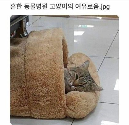 사이타마센세의진심울 동네 동물병원에 가서 우리 사랑이 미용 기다리고 있었어.그런데 원장님이 원장님 고양이를 막 찾으시는거야~문밖에도 없고 안에도 안보이는거야! 영희야 영희야 막 찾는데 대답은 없고 원장님은 얘가 어디갔지 어디갔지 이러셨음. 내 눈 앞에는 진료 보러 온 고양이 하나 밖에 없었어. 진료 기다리는 애구나 생각했는데, 이 영희가 원장님 영희였음. 다른 미용하러 온 애 가방안에 들어가서 자고있었음.