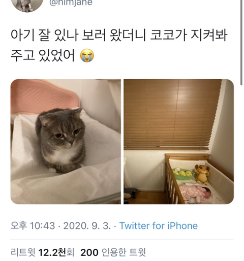 픽시멜맞아요. 거실 매트위에 아기 놀게 장난감 쥐어주거나 점퍼루 태워놓고 베란다에서 빨래 널고 있을때 애가 울면 두 마리 모두 저 찾으러 베란다로 와서는 막 안절부절 ㅋㅋㅋ 아기 울면 고양이들이 안절부절 기웃거리는 게 보여요. 잘 자다가도 아기 울면 화들짝 일어나는 모습도 보이고 ㅋㅋㅋ